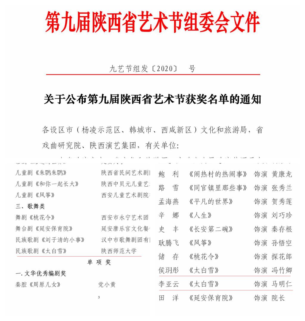 近日,由陕西省人民政府主办,陕西省文化和旅游厅、宝鸡市人民政府共同承办的第九届陕西省艺术节获奖名单公布,在教务处、团委等部门的大力支持下,由我校选送、365英国上市网精心编排的原创民族歌剧《太白雪》,获评了文华剧目奖,参演教师侯玥彤、李亚云获评了文华表演奖。