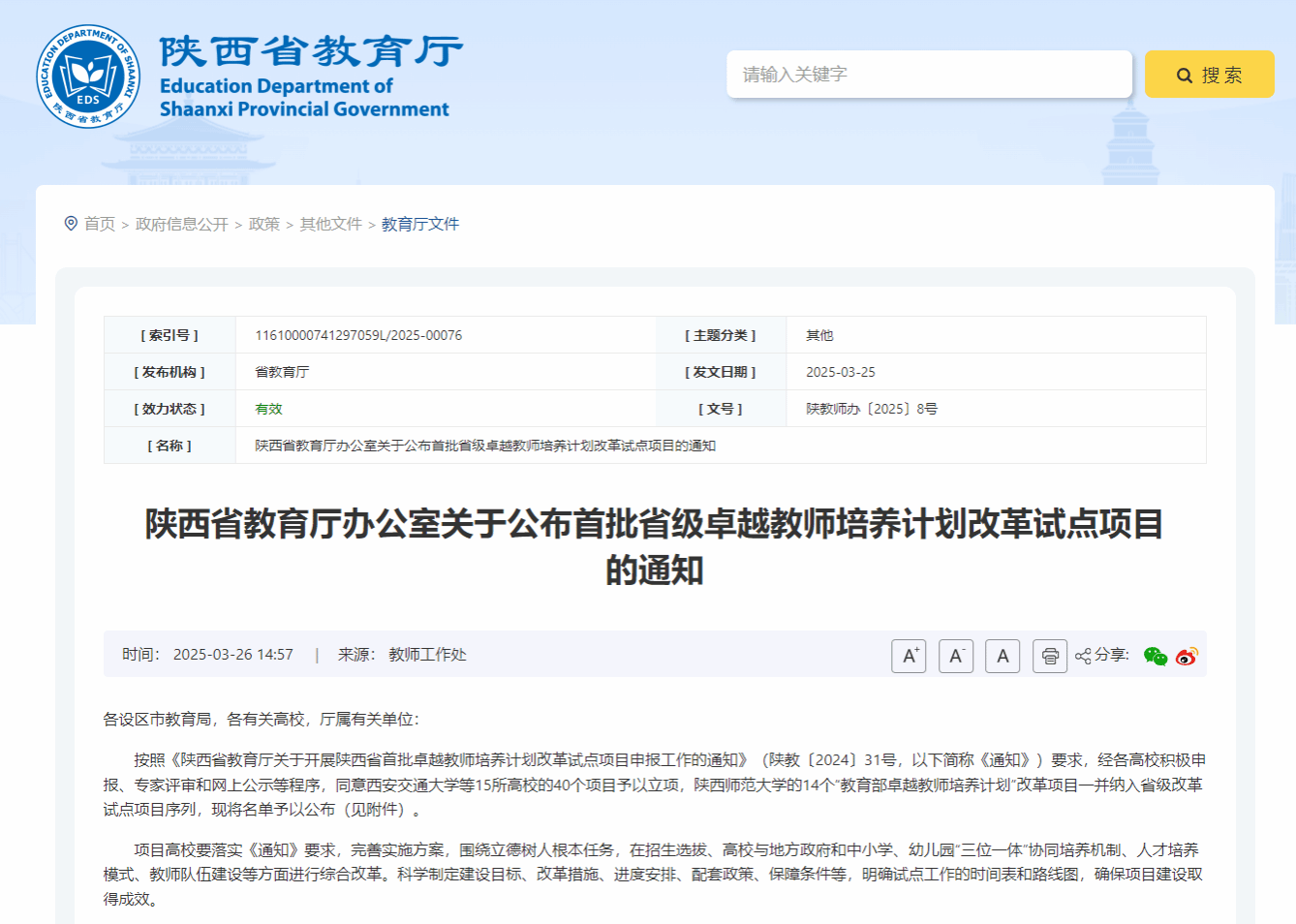 近日,陕西省教育厅公布了首批省级卓越教师培养计划改革试点项目名单,我校共17个项目入选,其中我院获批2项,分别是张娟教授负责的《本研衔接的卓越音乐教师的U-G-S培养体系构建》和韩晓勇教授负责的《本研衔接的卓越舞蹈教师培养体系构建》,其中张娟教授负责的项目“教育部卓越教师培养计划”改革项目纳入省级改革试点项目。